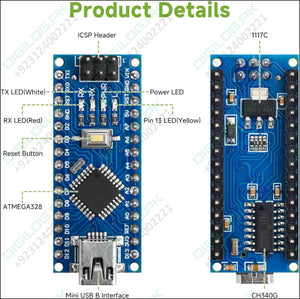 If you are lookin for Arduino Nano v3 price in pakistan, you are on the right place. Digilog.pk offers you best price of Arduino Nano v3. Arduino Nano with nano cable is small, complete, and breadboard-friendly board based on the ATmega328 (Arduino Nano 3.x) or ATmega168 (Arduino Nano 2.x). It has more or less the same functionality of the Arduino Duemilanove, but in a different package. It lacks only a DC power jack, and works with a Mini-B nano cable instead of a standard one.