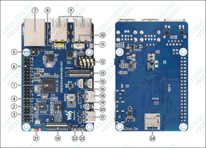 - The board features common peripheral interfaces such as MIPI-CSI, MIPI-DSI, USB 2.0 OTG, Ethernet, SDIO 3.0 SD card slot, microphone, speaker terminals, and RTC battery terminals.